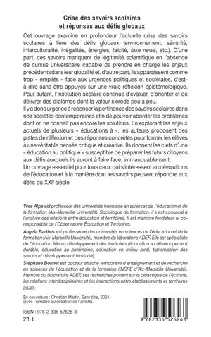 Cet ouvrage examine en profondeur l'actuelle crise des savoirs scolaires à l'ère des défis globaux (environnement, sécurité, interculturalité, inégalités, énergies, laïcité, fake news, etc.). D'une part, ces savoirs manquent de légitimité scientifique en l'absence de cursus universitaire capable de prendre en charge les enjeux précédents dans leur globalité et, d'autre part, ils apparaissent comme trop empilés face aux urgences politiques et sociétales, c'est-à-dire sans être appuyés sur une vraie réflexion épistémologique. Pour autant, l'institution scolaire continue d'évaluer, d'orienter et de délivrer des diplômes dont la valeur s'érode peu à peu. Il y a donc urgence à repenser la pertinence des savoirs scolaires dans nos sociétés contemporaines afin de pouvoir aborder les problèmes dont on ne connaît pas encore les solutions. En explorant les enjeux actuels de plusieurs éducations à, les auteurs proposent des pistes de réflexion et des réponses concrètes pour former les élèves à une véritable pensée critique et créative. Ils donnent les clefs d'une éducation au politique susceptible de préparer les futurs citoyens aux défis auxquels ils auront à faire face, immanquablement. Un ouvrage essentiel pour tous ceux qui s'intéressent aux évolutions de l'éducation et à la manière dont les savoirs peuvent répondre aux défis du XXIe siècle.
