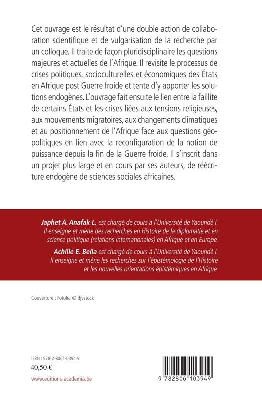 Cet ouvrage traite de façon pluridisciplinaire les crises majeures des États en Afrique post Guerre froide. Il tente de proposer des solutions endogènes à ces crises. Il fait ensuite le lien entre la faillite de certains États et les crises liées aux tensions religieuses, aux mouvements migratoires, aux changements climatiques et au positionnement de l'Afrique face aux questions géopolitiques en lien avec la reconfiguration de la notion de puissance depuis la fin de la Guerre froide.