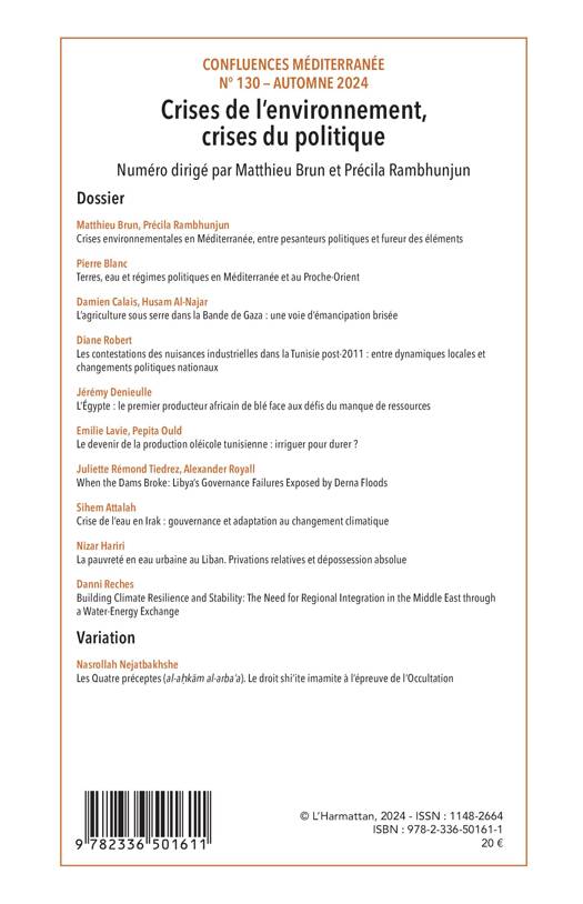 La Méditerranée et le Moyen-Orient constituent un arc de crises multiples, irrésolues et prolongées qui ressurgissent souvent avec une intensité dramatique. Crises de l'environnement et crises du politique sont fortement liées et leurs conséquences pèsent plus lourdement sur les populations les plus précaires ou les plus marginalisées. Elles révèlent les fragilités structurelles d'un espace sous contraintes. Les contributions invitent à penser les crises environnementales comme des révélateurs de crises politiques qui nécessitent de réviser les structures sociales, économiques et de gouvernance actuelles.