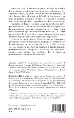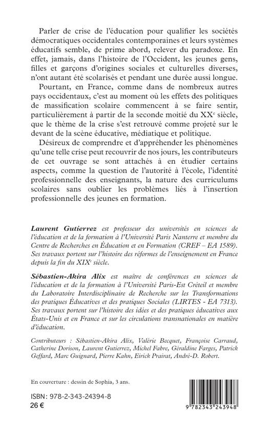 Parler de crise de l’éducation pour qualifier les sociétés démocratiques occidentales contemporaines et leurs systèmes éducatifs semble, de prime abord, relever du paradoxe. En effet, jamais, dans l’histoire de l’Occident, les jeunes gens d’origines sociales et culturelles diverses, n’ont autant été scolarisés et pendant une durée aussi longue. Pourtant, en France, c’est au moment où les effets des politiques de massification scolaire commencent à se faire sentir, particulièrement à partir de la seconde moitié du XX e siècle, que le thème de la crise s’est retrouvé comme projeté sur le devant de la scène éducative, médiatique et politique. Désireux de comprendre et d’appréhender les phénomènes qu’une telle crise peut recouvrir de nos jours, les contributeurs de cet ouvrage se sont attachés à en étudier certains aspects, comme la question de l’autorité à l’école, l’identité professionnelle des enseignants, la nature des curriculums scolaires sans oublier les problèmes liés à l’insertion professionnelle des jeunes en formation.