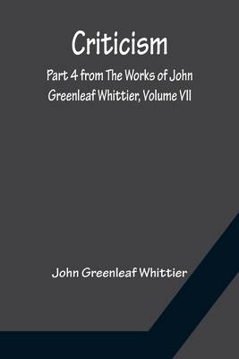 The book "" Criticism; Part 4 from The Works of John Greenleaf Whittier, Volume VII "" has been considered important throughout the human history, and so that this work is never forgotten we have made efforts in its preservation by republishing this book in a modern format for present and future generations. This whole book has been reformatted, retyped and designed. These books are not made of scanned copies and hence the text is clear and readable.