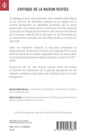 Ce dialogue à deux voix s'interroge sur le concept de réification, partant de la critique de la société bourgeoise et capitaliste proposée par le jeune Lukács dans son fameux essai La réification et la conscience de classe, pour se diriger par la suite vers une analyse minutieuse de la critique radicale de la réification et du fétichisme de la marchandise, articulée par Guy Debord dans La Société du Spectacle. Dans un troisième moment, la discussion théorique et philosophique s intéresse à la façon avec laquelle l'être social réifié et aliéné de la société capitaliste laisse ses traces dans la pensée philosophique moderne, à partir au moins du 18ème siècle. Autrement dit, on s'est donné comme tâche de mettre en lumière les antinomies de la pensée bourgeoise et ses rapports complexes aussi bien que profonds avec la société bourgeoise.
