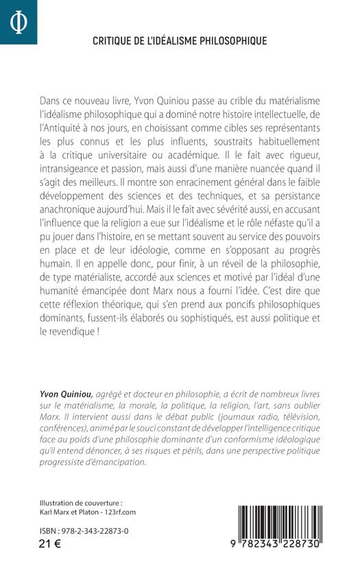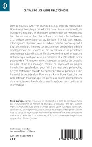 Cet ouvrage passe l’idéalisme philosophique qui a dominé notre histoire intellectuelle, de l’Antiquité à nos jours, au crible du matérialisme. Il fait apparaître son enracinement général dans le faible développement des sciences et des techniques, et sa persistance anachronique aujourd’hui. Critiquant l’influence que la religion a eue sur l’idéalisme, il en montre le rôle néfaste dans l’histoire, en se mettant souvent au service des pouvoirs en place et de leur idéologie. Yvon Quiniou en appelle donc, pour finir, à un réveil de la philosophie : un matérialisme accordé aux sciences et motivé par l’idéal progressiste d’une humanité émancipée, dont Marx nous a fourni l’idée.