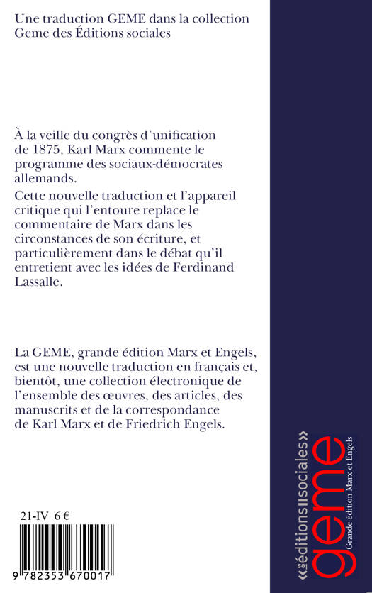 À la veille du congrès d'unification de 1875, Karl Marx commente le programme des sociaux-démocrates allemands.Cette nouvelle traduction et l'appareil critique qui l'entoure replace le commentaire de Marx dans les circonstances de son écriture, et particulièrement dans le débat qu'il entretient avec les idées de Ferdinand Lassalle.La GEME, grande édition Marx et Engels, est une nouvelle traduction en français et, dès 2010, une collection électronique de l'ensemble des oeuvres, des articles, des manuscrits et de la correspondance de Karl Marx et de Friedrich Engels.