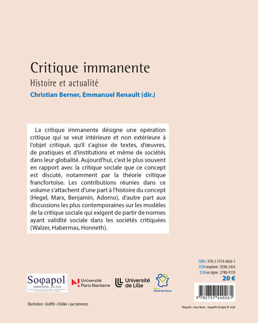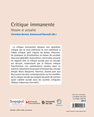 La critique immanente désigne une opération critique qui se veut intérieure et non extérieure à l’objet critiqué, qu’il s’agisse de textes, d’oeuvres, de pratiques et d’institutions et même de sociétés dans leur globalité. Aujourd’hui, c’est le plus souvent en rapport avec la critique sociale que ce concept est discuté, notamment par la théorie critique francfortoise. Les contributions réunies dans ce volume s’attachent d’une part à l’histoire du concept (Hegel, Marx, Benjamin, Adorno), d’autre part aux discussions les plus contemporaines sur les modèles de la critique sociale qui exigent de partir de normes ayant validité sociale dans les sociétés critiquées (Walzer, Habermas, Honneth).