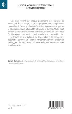 Cet essai revient sur chaque paragraphe de l'ouvrage de Heidegger Être et temps, pour en proposer une interprétation matérialiste. Il s'avère que la dualité être/étant pourrait renvoyer, sur le plan économique, à la dualité valeur/valeur d'usage. Mais il s'agit alors de la valorisation nationale allemande, en temps de crise de ce fait, Heidegger proposerait un anticapitalisme tronqué, et fétichisé. Le thème de la dictature du On, selon cette perspective, apparaîtra comme un thème fondamentalement antisémite. Heidegger, dès 1927, serait déjà non seulement antisémite, mais aussi bourgeois.