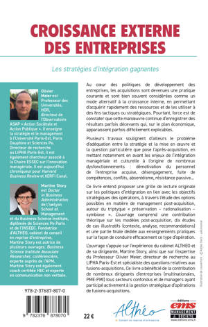 L’ouvrage s’appuie sur l’expérience du cabinet ALTHEO et de sa dirigeante, Martine Story, ainsi que sur l’expertise du Professeur Olivier Meier, directeur de recherche au LIPHA Paris-Est et spécialiste des questions relatives aux fusions-acquisitions. Ce livre a bénéficié de la contribution de nombreux dirigeants d’entreprises (multinationales, PME-PMI) tous secteurs confondus et de managers ayant participé activement à la gestion stratégique d’opérations de fusions-acquisitions.
