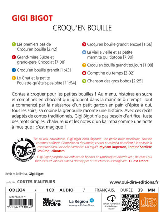 Contes à croquer pour les petites bouilles ! Au menu, histoires en sucre et comptines en chocolat qui tiptopent dans la marmite du temps. Tout a commencé par la naissance d'un petit garçon en pain d'épice à qui, tous les soirs, sa copine la grenouille raconte une histoire. Avec ces récits adaptés de contes traditionnels, Gigi Bigot n'a pas besoin d'artifice. Juste des mots simples, chaleureux et les notes d'un kalimba comme une boîte à musique : c'est magique !