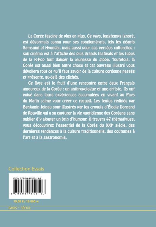 La Corée fascine de plus en Plus. Ce pays, longtemps ignoré, est désormais connu pour ses conglomérats, tels les géants Samsung et Hyundai mais aussi pour ses percées culturelles son cinéma est à l affiche des Plus grands festivals et les tubes de la K-Pop font danser la jeunesse du globe. Toutefois, la Corée est aussi bien autre chose et cet ouvrage illustré vous dévoilera tout ce qu il faut savoir de la culture coréenne Passée et Présente, au-delà des clichés. Ce livre est le fruit d une rencontre entre deux français amoureux de la Corée : un anthropologue et une artiste. Ils ont puisé dans leurs expériences accumulées en vivant au Pays du Matin calme Pour créer ce recueil. Les textes rédigés Par Benjamin Joinau sont illustrés par les croquis d Elodie Dornand de Rouville qui a su capturer la vie quotidienne des Coréens sans oublier d y ajouter un brin d humour. A travers 47 thématiques, vous découvrirez l essentiel e la Corée du XXIe siècle, des dernières tendances à la culture traditionnelle, des coutumes à l art et à la gastronomie.