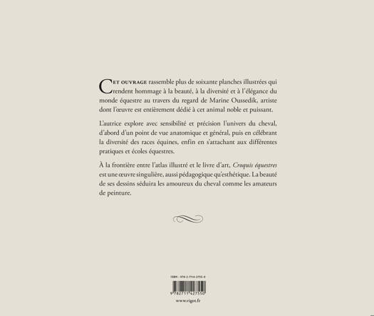 Cet ouvrage rassemble plus de soixante planches illustrées qui rendent hommage à la beauté, à la diversité et à l’élégance du monde équestre au travers du regard de Marine Oussedik, artiste dont l’œuvre est entièrement dédié à cet animal noble et puissant. L’autrice explore avec sensibilité et précision l’univers du cheval, d’abord d’un point de vue anatomique et général, puis en célébrant la diversité des races équines, enfin en s’attachant aux différentes pratiques et écoles équestres. À la frontière entre l’atlas illustré et le livre d’art, Croquis équestres est une œuvre singulière, aussi pédagogique qu’esthétique. La beauté de ses dessins séduira les amoureux du cheval comme les amateurs de peinture.
