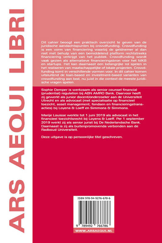 Dit cahier beoogt een praktisch overzicht te geven van de juridische aandachtspunten bij crowdfunding. Crowdfunding is een vorm van financiering waarbij de geldnemer al dan niet met behulp van een bemiddelend platform rechtstreeks financiering verkrijgt van het publiek. Crowdfunding wordt vaak gezien als alternatieve financieringsbron voor het MKB en startups. Het kan daarnaast een belangrijke rol spelen in het realiseren van maatschappelijke of lokale projecten. Crowdfunding komt in verschillende vormen voor. In dit cahier komen uitsluitend de loan-based en investment-based varianten van crowdfunding aan bod, nu juist in die context de meeste juridische vragen spelen.