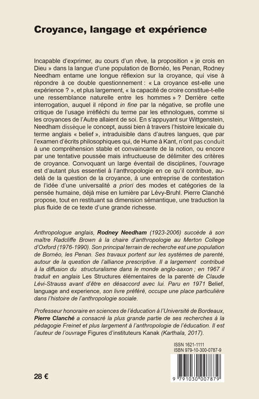 Incapable d’exprimer, au cours d’un rêve, la proposition « je crois en Dieu » dans la langue d’une population de Bornéo, les Penan, Rodney Needham entame une longue réflexion sur la croyance, qui vise à répondre à ce double questionnement : « La croyance est-elle une expérience ? », et plus largement, « la capacité de croire constitue‑t‑elle une ressemblance naturelle entre les hommes » ? Derrière cette interrogation, auquel il répond in fine par la négative, se profile une critique de l’usage irréfléchi du concept par les ethnologues, comme si les croyances de l’Autre allaient de soi. En s’appuyant sur Wittgenstein, Needham dissèque le concept, aussi bien à travers l’histoire lexicale du terme anglais « belief », intraduisible dans d’autres langues, que par l’examen d’écrits philosophiques qui, de Hume à Kant, n’ont pas conduit à une compréhension stable et convaincante de la notion, ou encore par une tentative poussée mais infructueuse de délimiter des critères de croyance. Convoquant un large éventail de disciplines, l’ouvrage est d’autant plus essentiel à l’anthropologie en ce qu’il contribue, au-delà de la question de la croyance, à une entreprise de contestation de l’idée d’une universalité a priori des modes et catégories de la pensée humaine, déjà mise en lumière par Lévy-Bruhl. Cette première traduction en français proposée par Pierre Clanché restitue, dans une langue très fluide, toute la dimension sémantique de ce texte d'une grande richesse.