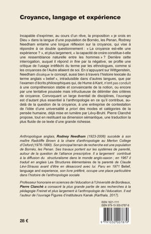 Convoquant un large éventail de disciplines, l’anthropologue Needham livre une réflexion sur la croyance (belief), et conteste l’usage irréfléchi du terme par les ethnologues, comme si les croyances de l’Autre allaient de soi.