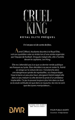 « Cruel King  » est un préquel de la série Royal Elite. Il s’agit d’une dark romance mettant en scène un harceleur, conçue pour un public adulte et averti et contenant des éléments qui pourraient choquer certaines personnes.