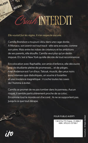 Elle voulait fuir les règles. Il n’en respecte aucune. Camilla Brandson a toujours vécu dans une cage dorée. À Monaco, son avenir est tout tracé : elle sera avocate, comme son père. Mais entre les robes de créateurs et les ambitions de ses parents, elle étouffe. Camilla veut plus qu’un destin imposé. Elle veut respirer, choisir, aimer. Et c’est à New York qu’elle décide de tout recommencer. En colocation avec Raphaëlle, son amie d’enfance, elle découvre une vie étudiante pleine de promesses… et de pièges. Axel Anderson est l’un d’eux. Tatoué, musclé, des yeux noirs aussi intenses que diaboliques, un sourire à fossettes et une insolence magnétique : il coche toutes les cases de l’homme à éviter. Camilla se promet de ne pas tomber dans le panneau. Aucun risque : il semble particulièrement proche de sa coloc. En somme tout le monde est d’accord : ils ne se supportent pas. Jusqu’à ce que tout dérape.