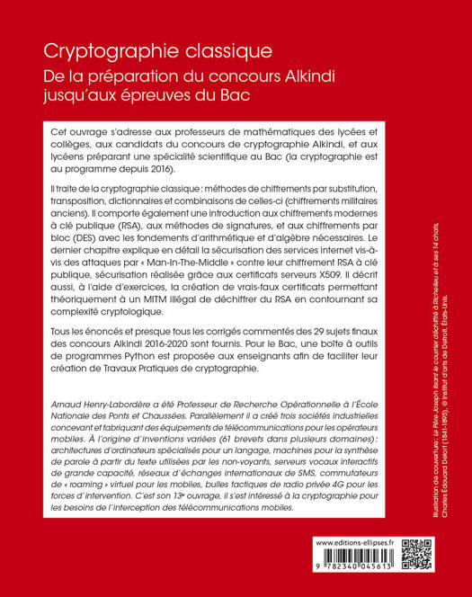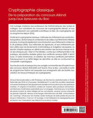 Cet ouvrage s’adresse aux professeurs de mathématiques des lycées et collèges, aux candidats du concours de cryptographie Alkindi, et aux lycéens préparant le bac scientifique.
