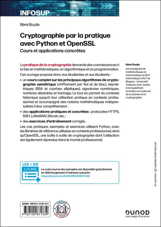 - un cours complet sur les principaux algorithmes de cryptographie, depuis le contexte historique de leur création jusqu'aux notions mathématiques indispensables à leur compréhension ;