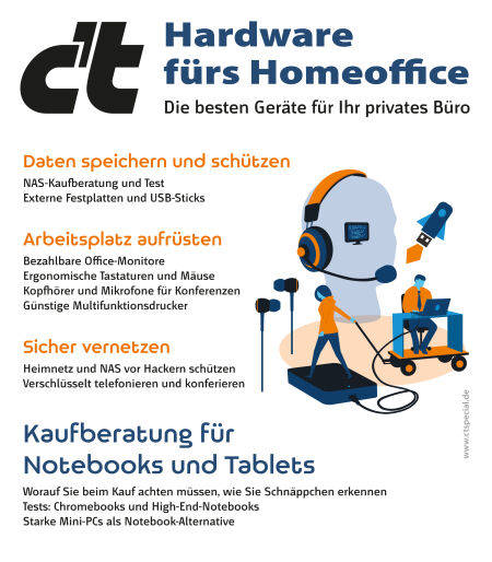 Die Arbeit im Homeoffice gelingt nicht nur mit der richtigen Software, sondern vor allem mit der passenden Hardware. Das neue Sonderheft "c't Hardware fürs Homeoffice" hilft und berät bei der Technik-Auswahl von Notebook oder Tablet, ergonomischem Zubehör für Ihren Heim-Arbeitsplatz sowie Alternativen für LAN-Strippen in den eigenen vier Wänden. Dabei darf auch die Datensicherung nicht vernachlässigt werden: Neben Speichermedien und NAS, zeigen wir, wie Sie Ihre Daten richtig verschlüsseln.