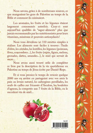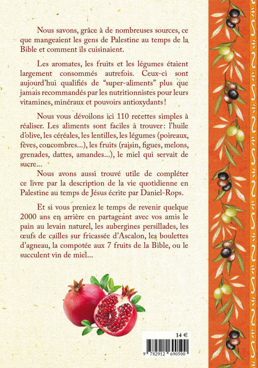 Nous vous dévoilons ici 110 recettes simples à réaliser. Les aliments sont faciles à trouver : l’huile d’olive, les céréales, les lentilles, les légumes (poireaux, fèves, concombres...), les fruits (raisin, figues, melons, grenades, dattes, amandes...), le miel qui servait de sucre... Nous avons aussi trouvé utile de compléter ce livre par la description de la vie quotidienne en Palestine au temps de Jésus écrite par Daniel-Rops.