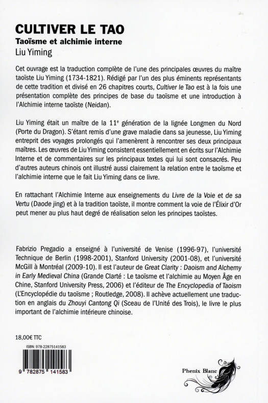 Cet ouvrage est la traduction complète de l’une des principales œuvres du maître taoïste Liu Yiming (1734-1821). Rédigé par l’un des plus éminents représentants de cette tradition et divisé en 26 chapitres courts, Cultiver le Tao est à la fois une présentation complète des principes de base du taoïsme et une introduction à l’Alchimie interne taoïste (Neidan). Liu Yiming était un maître de la 11e génération de la lignée Longmen du Nord (Porte du Dragon). S’étant remis d’une grave maladie dans sa jeunesse, Liu Yiming entreprit des voyages prolongés qui l’amenèrent à rencontrer ses deux principaux maîtres. Les œuvres de Liu Yiming consistent essentiellement en écrits sur l’Alchimie Interne et de commentaires sur les principaux textes qui lui sont consacrés. Peu d’autres auteurs chinois ont illustré aussi clairement la relation entre le taoïsme et l’alchimie interne que le fait Liu Yiming dans ce livre. En rattachant l’Alchimie Interne aux enseignements du Livre de la Voie et de sa Vertu (Daode jing) et à la tradition taoïste, il montre comment la voie de l’Élixir d’Or peut mener au plus haut degré de réalisation selon les principes taoïstes.