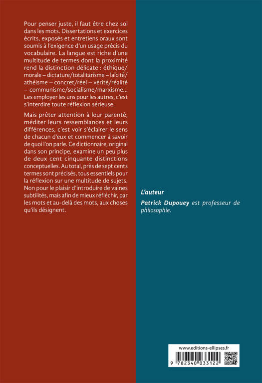 Mais prêter attention à leur parenté, méditer leurs ressemblances et leurs différences, c'est voir s'éclairer le sens de chacun d'eux et commencer à savoir de quoi l'on parle. Ce dictionnaire, original dans son principe, examine un peu plus de deux cent cinquante distinctions conceptuelles. Au total, près de sept cents termes sont précisés, tous essentiels pour la réflexion sur une multitude de sujets. Non pour le plaisir d'introduire de vaines subtilités, mais afin de mieux réfléchir, par les mots et au-delà des mots, aux choses qu'ils désignent.