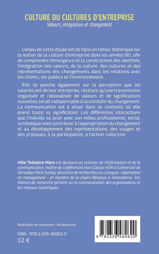 L'enjeu de cette étude est de faire un retour historique sur la notion de la culture d'entreprise dans les années 80, afin de comprendre l'émergence et la construction des identités, l'intégration des valeurs, de la culture, des cultures et des représentations des changements dans les relations avec les clients, les publics et l'environnement. Elle se penche également sur la perception que les salariés ont de leur entreprise, révélant qu'une transmission organisée et rationalisée de valeurs et de significations nouvelles serait indispensable à la conduite du changement. La communication est à situer dans un contexte où elle prend toute sa signification. Les différentes interactions que l'individu va avoir avec son milieu professionnel, social, symbolique vont contribuer à l'appropriation du changement et au développement des représentations, des usages et des pratiques, à la participation, à l'action collective.