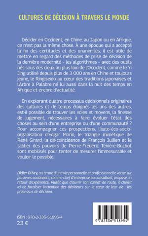 Décider en Occident, en Chine, au Japon ou en Afrique, ce n'est pas la même chose. À une époque qui a accepté la fin des certitudes et des unanimités, il est utile de mettre en regard des méthodes de prise de décision de la dernière modernité - les algorithmes - avec des outils nés sous des cieux au plus loin de l'Occident, comme le Yi Jing utilisé depuis plus de 3 000 ans en Chine et toujours jeune, le Ringiseïdo au coeur des traditions japonaises et l'Arbre à Palabre né lui aussi dans la nuit des temps en Afrique et encore d'actualité. En explorant quatre processus décisionnels originaires des cultures et de temps éloignés les uns des autres, est-il possible de trouver les voies et moyens, la finesse de jugement, nécessaires à faire évoluer l'état des choses au sein d'une entreprise ou d'une communauté ? Pour accompagner ces prospections, l'auto-éco-socio-organisation d'Edgar Morin, le triangle mimétique de René Girard, la dé-coïncidence de François Jullien et le tablier des pouvoirs de Pierre-Frédéric Ténière-Buchot sont mobilisés pour tenter de mesurer l'immesurable et vouloir le possible.