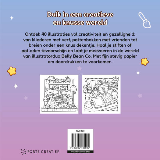 Duik in een creatieve en knusse wereld met 40 illustraties vol creativiteit en gezelligheid; van kliederen met verf, pottenbakken met vrienden tot breien onder een knus dekentje. Haal je stiften of potloden tevoorschijn en laat je in dit kleurboek meevoeren in de wereld van illustratorduo Belly Bean Co.