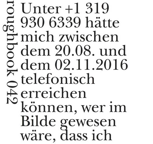"Unter +1 319 930 6339 hätte mich", schreibt Mara Genschel zur Entstehung ihres roughbooks, "zwischen dem 20.08. und dem 02.11.2016 telefonisch erreichen können, wer im Bilde gewesen wäre, dass ich das Angebot angenommen hatte, für diesen Zeitraum in der 430 North Clinton Street, Iowa City, IA 52242 (USA) offiziell die deutsche Literatur zu repräsentieren. Mein sehr preiswertes amerikanisches Mobiltelefon blieb allerdings ungenutzt, bis ich entdeckte, dass sich die Lernkurve seiner rustikalen Korrekturfunktion mit meiner Fehlbarkeit sowohl als nationale Repräsentantin wie auch als Akademikerin Amerikanerin auf Zeit aufschlussreich engführen ließ. Ich fing an, Überlegungen zu notieren, in denen meine teilweise verzweifelte Situation in dilettantischer Manier zu reflektieren ich mich nicht schämen musste, da das Gerät mich um immer noch eine Peinlichkeit oder Dummheit übertraf."
