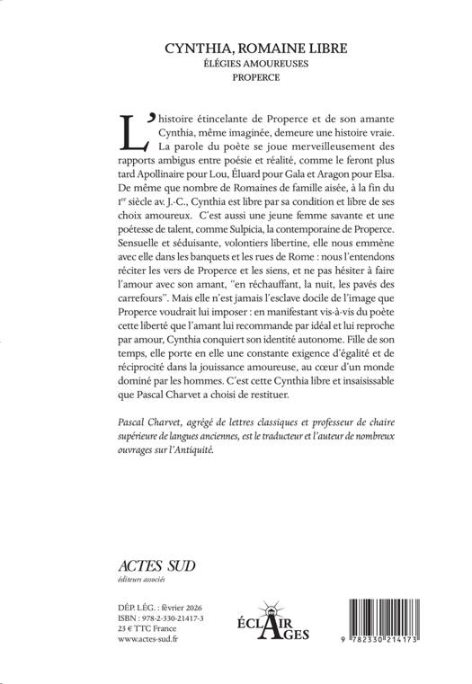 L'histoire étincelante de Properce et de son amante Cynthia, même imaginée, demeure une histoire vraie. La parole du poète se joue merveilleusement des rapports ambigus entre poésie et réalité. De même que nombre de Romaines de famille aisée, à la fin du Ier siècle av. J.-C., Cynthia est libre par sa condition et libre de ses choix amoureux. C'est aussi une jeune femme savante et une poétesse de talent. Sensuelle et séduisante, volontiers libertine, elle nous emmène avec elle dans les banquets et les rues de Rome. Fille de son temps, elle porte en elle une constante exigence d'égalité et de réciprocité dans la jouissance amoureuse, au coeur d'un monde dominé par les hommes. C'est cette Cynthia libre et insaisissable que Pascal Charvet a choisi de restituer.