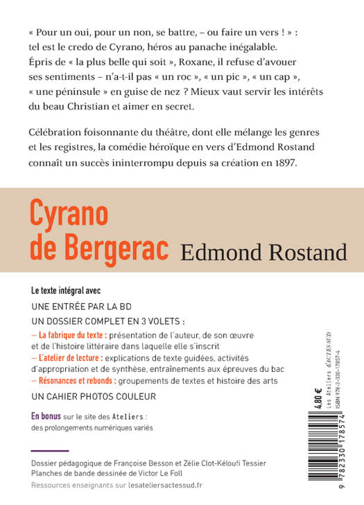 « Pour un oui, pour un non, se battre - ou faire un vers ! » : tel est le credo de Cyrano, héros au panache inégalable. Amoureux de « la plus belle qui soit », Roxane, il refuse d'avouer ses sentiments - n'a-t-il pas « un roc », « un pic », « un cap », « une péninsule » en guise de nez ? Mieux vaut servir les intérêts du beau Christian, et aimer en secret. Célébration foisonnante du théâtre, dont elle mélange les genres et les registres, la comédie héroïque en vers d'Edmond Rostand n'a cessé d'être montée sur les planches depuis son entrée au répertoire de la Comédie-Française en 1938.