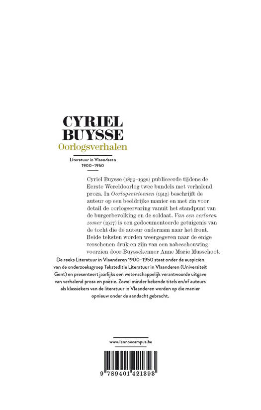 Herontdekking van het werk van Cyriel Buysse Cyriel Buysse (1859–1932) publiceerde tijdens de Eerste Wereldoorlog twee bundels met verhalend proza. In Oorlogsvisioenen (1915) beschrijft de auteur op een beeldrijke manier en met zin voor detail de oorlogservaring vanuit het standpunt van de burgerbevolking en de soldaat. Van een verloren zomer (1917) is een gedocumenteerde getuigenis van de tocht die de auteur ondernam naar het front. Beide teksten worden weergegeven naar de enige verschenen druk en zijn van een nabeschouwing voorzien door Buyssekenner Anne Marie Musschoot. De reeks Literatuur in Vlaanderen 1900–1950 staat onder de auspiciën van de onderzoeksgroep Teksteditie Literatuur in Vlaanderen (Universiteit Gent) en presenteert jaarlijks een wetenschappelijk verantwoorde uitgave van verhalend proza en poëzie. Zowel minder bekende titels en/of auteurs als klassiekers van de literatuur in Vlaanderen worden op die manier opnieuw onder de aandacht gebracht.