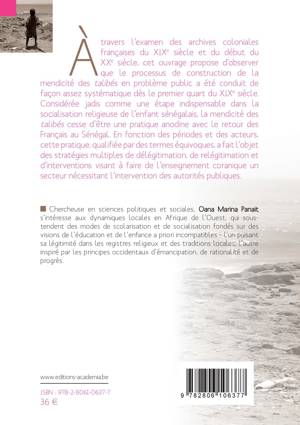 À travers l'examen des archives coloniales françaises du XIXe siècle et du début du XXe siècle, cet ouvrage propose d'observer que le processus de construction de la mendicité des talibés en problème public a été conduit de façon assez systématique dès le premier quart du XIXe siècle. Considérée jadis comme une étape indispensable dans la socialisation religieuse de l'enfant sénégalais, la mendicité des talibés cesse d'être une pratique anodine avec le retour des Français au Sénégal.