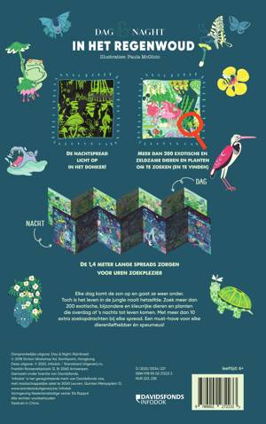 Elke dag komt de zon op en gaat ze weer onder. Toch is het leven in de jungle nooit hetzelfde. Zoek meer dan 200 exotische, bijzondere en kleurrijke dieren en planten die overdag of ’s nachts tot leven komen. Leg de nachtkant van het boek even onder een lamp en de jungle komt tot leven met glow in the dark! Met meer dan 10 extra zoekopdrachten bij elke spread. Een must-have voor elke dierenliefhebber én speurneus!