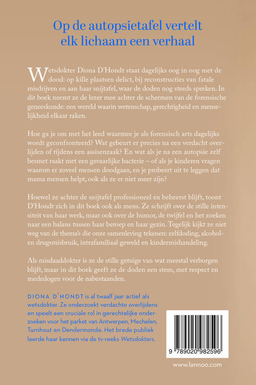 Wetsdokter Diona D'Hondt staat dagelijks oog in oog met de dood: op kille plaatsen delict, bij reconstructies van fatale misdrijven en aan haar snijtafel, waar de doden nog steeds spreken. In dit boek neemt ze de lezer mee achter de schermen van de forensische geneeskunde: een wereld waarin wetenschap, gerechtigheid en menselijkheid elkaar raken.