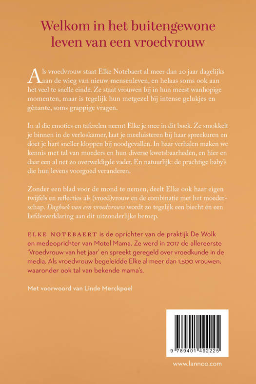 Als vroedvrouw staat Elke Notebaert al meer dan 20 jaar dagelijks aan de wieg van nieuw mensenleven, en helaas soms ook aan het veel te snelle einde. Ze staat vrouwen bij in hun meest wanhopige momenten, maar is tegelijk hun metgezel bij intense gelukjes en gênante, soms grappige vragen. In al die emoties en taferelen neemt Elke je mee in dit boek. Ze smokkelt je binnen in de verloskamer, laat je meeluisteren bij haar spreekuren en doet je hart sneller kloppen bij noodgevallen. In haar verhalen maken we kennis met tal van moeders en hun diverse kwetsbaarheden, en hier en daar een al net zo overweldigde vader. En natuurlijk: de prachtige baby's die hun levens voorgoed veranderen. Zonder een blad voor de mond te nemen, deelt Elke ook haar eigen twijfels en reflecties als (vroed)vrouw en de combinatie met het moederschap. Dagboek van een vroedvrouw wordt zo tegelijk een biecht én een liefdesverklaring aan dit uitzonderlijke beroep.