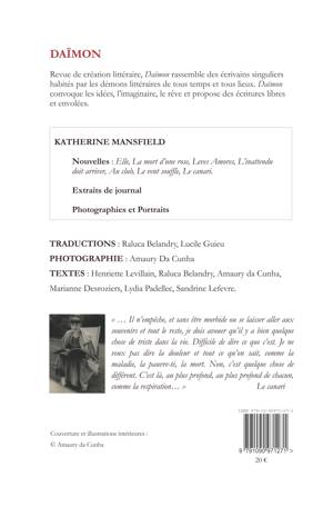 Primesautière, vraie et passionnée - autant dans la vie que dans les mots - Katherine Mansfield a laissé une trace indélébile sur la littérature. Discrète, sans être sauvage, Mansfield n'est pas une mondaine et ne cherche l'approbation d'aucun groupe ni courant. Fidèle à ses inspirations intimes, elle oeuvre, brodant avec habileté des histoires et des personnages qui marqueront les esprits. Exilée audacieuse, elle tisse son chemin de femme et d'auteure avec obstination et confiance. Hélas, un court voyage dans sa propre vie, mais un long périple offert à nos imaginaires, grâce à ses nouvelles exquises, ses journaux, notes et correspondances. Nous revenons à Mansfield, comme nous étions revenus à Lawrence et Woolf, dans les précédents hors-séries. Ce sont nos daïmons modernistes, qui se sont rencontrés, connus et admirés les uns les autres, de leur temps. Ce choix n'est donc pas anodin, car ces écrivains forment la voûte d'une littérature nouvelle, aux aurores du XXème siècle, à laquelle nous sommes sensibles.Devoir à la mémoire, cadeau au désir de singularité de Daïmon, nous souhaitons faire redécouvrir ces écrivains à travers une mosaïque d'études et de nouvelles traductions, souvent d'oeuvres moins connues (nouvelles, extraits de romans, essais, journaux, lettres). Soyez les bienvenus dans ce nouvel hors-série, édité avec la participation de : Henriette Levillain (auteure d'une biographie de Mansfield, éd. Flammarion), Amaury da Cunha, Lydia Padellec, Marianne Desroziers, Sandrine Lefevre, Lucile Guieu, Raluca Belandry. Avec, en illustrations, une vingtaine de photographies prises par Amaury da Cunha en Nouvelle Zélande.