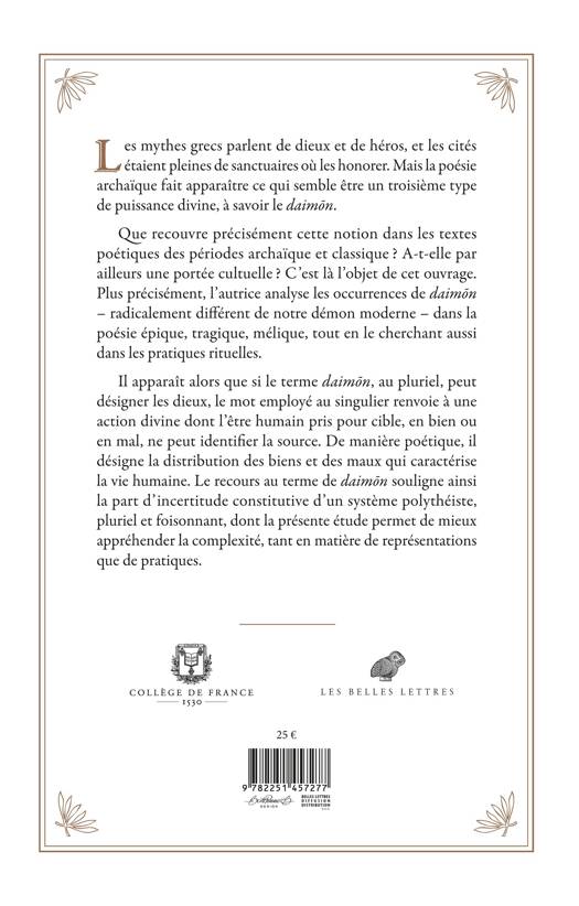 Les mythes grecs parlent de dieux et de heros, et les cites etaient pleines de sanctuaires ou les honorer. Mais la poesie archaique fait apparaitre ce qui semble etre un troisieme type de puissance divine, a savoir le daimon. Que recouvre precisement cette notion dans les textes poetiques des periodes archaique et classique ? A-t-elle par ailleurs une portee cultuelle ? C'est la l'objet de cet ouvrage. Plus precisement, l'autrice analyse les occurrences de daimon - radicalement different de notre demon moderne - dans la poesie epique, tragique, melique, tout en le cherchant aussi dans les pratiques rituelles. Il apparait alors que si le terme daimon, au pluriel, peut designer les dieux, le mot employe au singulier renvoie a une action divine dont l'etre humain pris pour cible, en bien ou en mal, ne peut identifier la source. De maniere poetique, il designe la distribution des biens et des maux qui caracterise la vie humaine. Le recours au terme de daimon souligne ainsi la part d'incertitude constitutive d'un systeme polytheiste, pluriel et foisonnant, dont la presente etude permet de mieux apprehender la complexite, tant en matiere de representations que de pratiques.