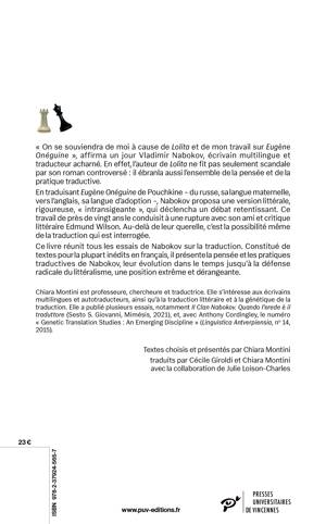 Ce livre réunit tous les essais de Nabokov sur la traduction. Constitué de textes pour la plupart inédits en français, il présente la pensée et les pratiques traductives de Nabokov, leur évolution dans le temps jusqu’à la défense radicale du littéralisme, une position extrême et dérangeante.
