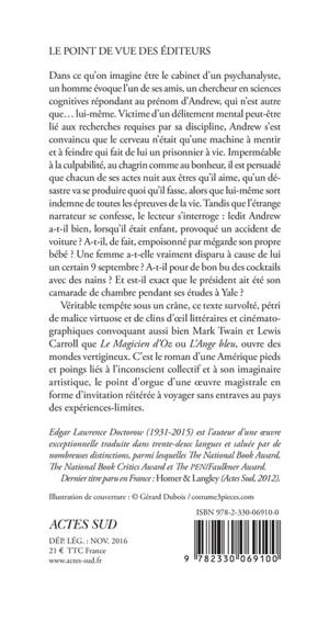 Dans ce qu'on imagine être le cabinet d'un psychanalyste, un homme évoque l'un de ses amis, un chercheur en sciences cognitives répondant au prénom d'Andrew, qui n'est autre que... lui-même. Victime d'un délitement mental peut-être lié aux recherches requises par sa discipline, Andrew s'est convaincu que le cerveau n'était qu'une machine à mentir et à feindre qui fait de lui un prisonnier à vie. Imperméable à la culpabilité, au chagrin comme au bonheur, il est persuadé que chacun de ses actes nuit aux êtres qu'il aime, qu'un désastre va se produire quoi qu'il fasse, alors que lui-même sort indemne de toutes les épreuves de la vie. Tandis que l'étrange narrateur se confesse, le lecteur s'interroge : ledit Andrew a-t-il bien, lorsqu'il était enfant, provoqué un accident de voiture ? A-t-il, de fait, empoisonné par mégarde son propre bébé ? Une femme a-t-elle vraiment disparu à cause de lui un certain 9 septembre ? A-t-il pour de bon bu des cocktails avec des nains ? Et est-il exact que le président ait été son camarade de chambre pendant ses études à Yale ? Véritable tempête sous un crâne, ce texte survolté, pétri de malice virtuose et de clins d'oeil littéraires et cinématographiques convoquant aussi bien Mark Twain et Lewis Carroll que «Le Magicien d'Oz» ou «L'Ange bleu», ouvre des mondes vertigineux. C'est le roman d'une Amérique pieds et poings liés à l'inconscient collectif et à son imaginaire artistique, le point d'orgue d'une oeuvre magistrale en forme d'invitation réitérée à voyager sans entraves au pays des expériences-limites.