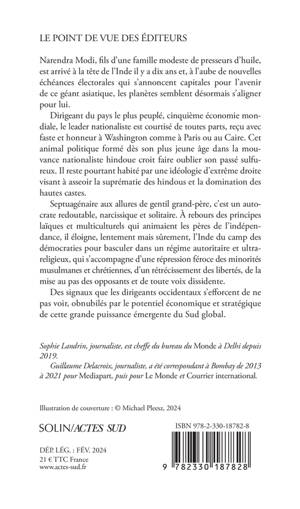 Narendra Modi, fils d'une famille modeste de presseurs d'huile, est arrivé à la tête de l'Inde il y a dix ans et, à l'aube de nouvelles échéances électorales qui s'annoncent capitales pour l'avenir de ce géant asiatique, les planètes semblent désormais s'aligner pour lui. Dirigeant du pays le plus peuplé, cinquième économie mondiale, le leader nationaliste est courtisé de toutes parts, reçu avec faste et honneur à Washington comme à Paris ou au Caire. Cet animal politique formé dès son plus jeune âge dans la mouvance nationaliste hindoue croit faire oublier son passé sulfureux. Il reste pourtant habité par une idéologie d'extrême droite visant à asseoir la suprématie des hindous et la domination des hautes castes. Septuagénaire aux allures de gentil grand-père, c'est un autocrate redoutable, narcissique et solitaire. À rebours des principes laïques et multiculturels qui animaient les pères de l'indépendance, il éloigne, lentement mais sûrement, l'Inde du camp des démocraties pour basculer dans un régime autoritaire et ultra- religieux, qui s'accompagne d'une répression féroce des minorités musulmanes et chrétiennes, d'un rétrécissement des libertés, de la mise au pas des opposants et de toute voix dissidente. Des signaux que les dirigeants occidentaux s'efforcent de ne pas voir, obnubilés par le potentiel économique et stratégique de cette grande puissance émergente du Sud global.