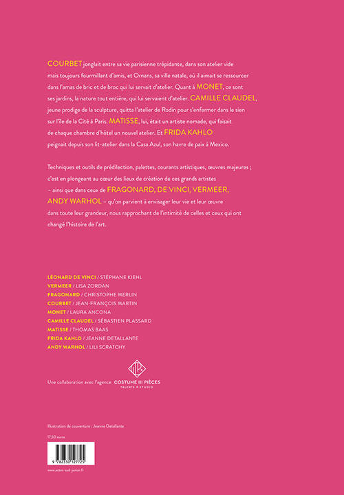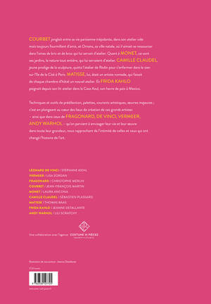Courbet jonglait entre sa vie parisienne trépidante, dans son atelier vide mais toujours fourmillant d'amis, et Ornans, sa ville natale, où il aimait se ressourcer dans l'amas de bric et de broc qui lui servait d'atelier. Quant à Monet, ce sont ses jardins et la nature tout entière qui lui servaient d'atelier. Camille Claudel, jeune prodige de la sculpture, quitte l'atelier de Rodin pour s'enfermer dans le sien sur l'île de la Cité à Paris. Matisse, lui, est un artiste nomade, qui fait de chaque chambre d'hôtel un nouvel atelier. Techniques et outils de prédilection, palettes, courants artistiques, oeuvres majeures ; c'est en plongeant au coeur des lieux de création de ces grands artistes - ainsi que ceux de Fragonard, de Vinci, Picasso, Vermeer, Frida Kahlo, Andy Warhol - qu'on parvient à envisager leur oeuvre, en nous rapprochant de l'intimité des artistes.