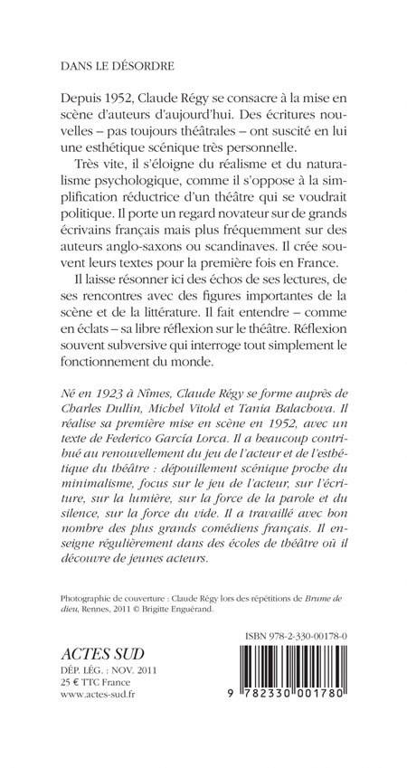 Claude Régy, né en 1923 à Nîmes, après une formation d'acteur auprès de grands maîtres de la scène (Dullin, Balachova, Vitold), s'est consacré à la mise en scène d'auteurs contemporains depuis les années 1950, créant pour la première fois en France certains textes de Pirandello, Kleist, Duras, Pinter, Saunders, Stoppard, Arrabal, Bond, Sarraute, Handke, Botho Strauss, Jon Fosse... ouvrant considérablement le répertoire des oeuvres contemporaines. Il a aussi fait découvrir des acteurs, comme Gérard Depardieu en 1971, Martial Di Fonzo Bo, Laurent Cazanave, entre autres. Il laisse résonner ici les échos de ses lectures, de ses rencontres et de ses nombreuses mises en scène.