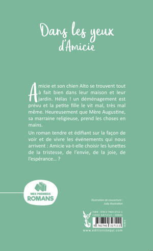 Amicie est myope, très myope même, heureusement que son chien Alto l’accompagne partout ! Elle se cache pour ne pas faire ses cartons, car elle n’a pas du tout envie de déménager, de quitter son jardin et sa maison. C’est alors que Mère Augustine, sa marraine religieuse, lui apparaît dans sa cabane sous le vieux tilleul et prend les choses en mains : elle lui propose différentes paires de lunettes qui lui feront voir la vie par le prisme de la joie, ou de la tristesse, ou de la colère, ou d’un optimisme béat… Amicie, le jour de la rentrée, sera mise face à sa liberté de choix : la paire de lunettes qu’elle choisira déterminera l’ambiance de toute l’année scolaire. Si elle choisit bien, sa marraine garde pour elle en cadeau une paire de lunettes très spéciales…