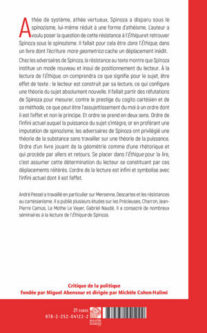 Athee de systeme, athee vertueux, Spinoza a disparu sous le spinozisme, lui-meme reduit a une forme d'atheisme. L'auteur a voulu poser la question de cette resistance a l'Ethique et retrouver Spinoza sous le spinozisme. Il fallait pour cela etre dans l'Ethique, dans un livre dont l'ecriture more geometrico cache un deplacement inedit. Chez les adversaires de Spinoza, la resistance au texte montre que Spinoza institue un mode nouveau et inoui de positionnement du lecteur. A la lecture de l'Ethique, on comprendra ce que signifie pour le sujet, etre effet de texte: le lecteur est construit par sa lecture, ce qui configure une theorie du sujet absolument nouvelle. Il fallait partir des refutations de Spinoza pour mesurer, contre le prestige du cogito cartesien et de sa methode, ce que peut etre l'assujettissement du moi a un ordre dont il est l'effet et non le principe. Et ordre se prend en deux sens. Ordre de l'infini actuel auquel la puissance du sujet s'integre, or en proferant une imputation de spinozisme, les adversaires de Spinoza ont privilegie une theorie de la substance sans travailler sur une theorie de la puissance. Ordre d'un livre jouant de la geometrie comme d'une rhetorique et qui procede par allers et retours. Se placer dans l'Ethique pour la lire, c'est assumer cette determination du lecteur se constituant par ces deplacements reiteres. L'ordre de la lecture est infini et symbolise avec l'infini actuel dont il est l'effet.