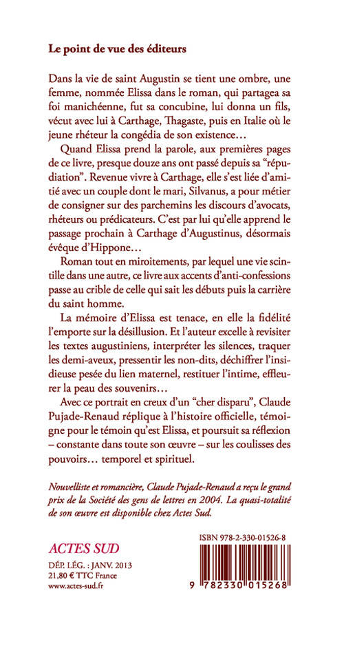 Dans la vie de saint Augustin se tient une ombre, une femme, nommée Elissa dans le roman, qui partagea sa foi manichéenne, fut sa concubine, lui donna un fils, vécut avec lui à Carthage, Thagaste, puis en Italie où le jeune rhéteur la congédia de son existence...