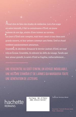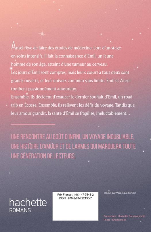 Ansel rêve de faire des études de médecine. Lors d’un stage en soins intensifs, il fait la connaissance d’Emil, un jeune homme de son âge, atteint d’une tumeur au cerveau. Les jours d’Emil sont comptés, mais leurs coeurs à tous deux sont grands ouverts, et leur univers commun sans limite. Emil et Ansel tombent passionnément amoureux. Ensemble, ils décident d’exaucer le dernier souhait d’Emil, un road trip en Écosse. Ensemble, ils relèvent les défis du voyage. Tandis que leur amour grandit, la santé d’Emil se fragilise, inéluctablement… Une rencontre au goût d’infini, un voyage inoubliable, une histoire d’amour et de larmes qui marquera toute une génération de lecteurs.