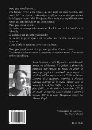 Dans quel monde on vit...<br /> Une femme révèle à ses enfants qu’une autre vie était possible, sans maternité. Un patron charismatique applique une notion particulière de la logique industrielle. Une jeune fille ne sait plus à quelle morale se vouer, qui sont les bons et qui les méchants. <br /> Dans quel monde on vit...<br /> Les artistes contemporains reculent plus loin encore les frontières de l’absurde.<br /> La dictature est une affaire de famille.<br /> Le routier se pend après avoir entraîné son camion sur une pente honteuse.<br /> L’ange d’affaires retourne sa veste côté démon. <br /> Dans quel monde on vit n’est pas une question, c’est un constat.<br /> Ces onze nouvelles orientent le projecteur de manière à créer d’immenses ombres au tableau.<br /><br /> Ralph Vendôme est né à Beyrouth et vit à Bruxelles depuis son adolescence. Il a publié La théorie du parapluie aux éditions du Scalde en 2019, un recueil qui explore les similitudes entre enfance et vieillesse, et L’horloge interne en 2020 aux éditions Lamiroy. <br />