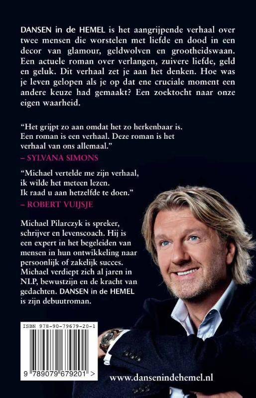 DANSEN IN DE HEMEL is het aangrijpende verhaal over twee mensen die worstelen met liefde en dood in een decor van glamour, geldwolven en grootheidswaan. Een actuele roman over verlangen, geld, geluk en echte liefde. Een zoektocht naar onze eigen waarheid.
