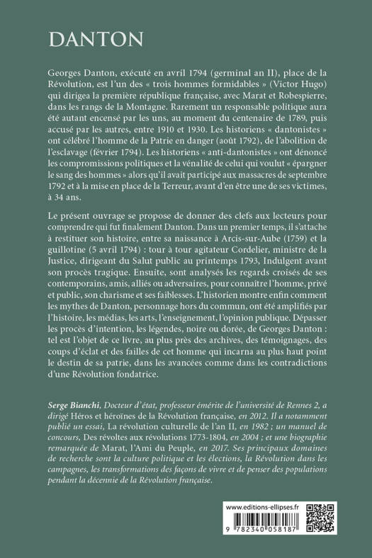 Le présent ouvrage se propose de donner des clefs aux lecteurs pour comprendre quel fut finalement Danton. Dans un premier temps, il s’attache à restituer son histoire, entre la naissance à Arcis-sur-Aube (1759) et la guillotine (5 avril 1794) : tour à tour agitateur Cordelier, ministre de la Justice, dirigeant du Salut public au printemps 1793, Indulgent avant son procès tragique. Ensuite, sont analysés les regards croisés de ses contemporains, amis, alliés ou adversaires, pour connaître l’homme, privé et public, son charisme et ses faiblesses. L’historien montre enfin comment les mythes de Danton, personnage hors du commun, ont été amplifiés par l’histoire, les médias, les arts, l’enseignement, l’opinion publique. Dépasser les procès d’intention, les légendes, noire ou dorée, de Georges Danton : tel est l’objet de ce livre, au plus près des archives, des témoignages, des coups d’éclat et des failles de cet homme, Danton, qui incarna au plus haut point le destin de sa patrie, dans les avancées comme dans les contradictions d’une Révolution fondatrice.